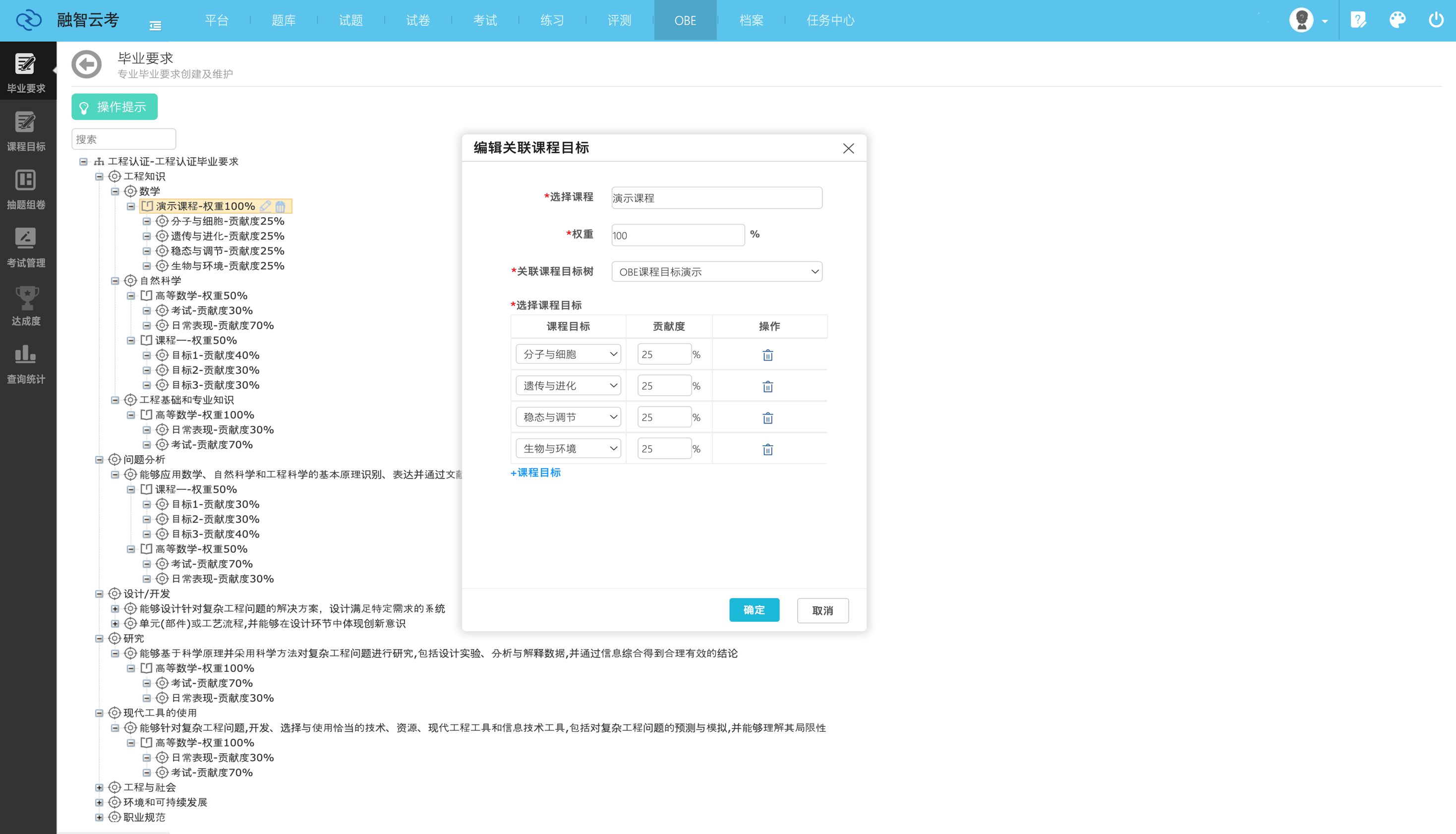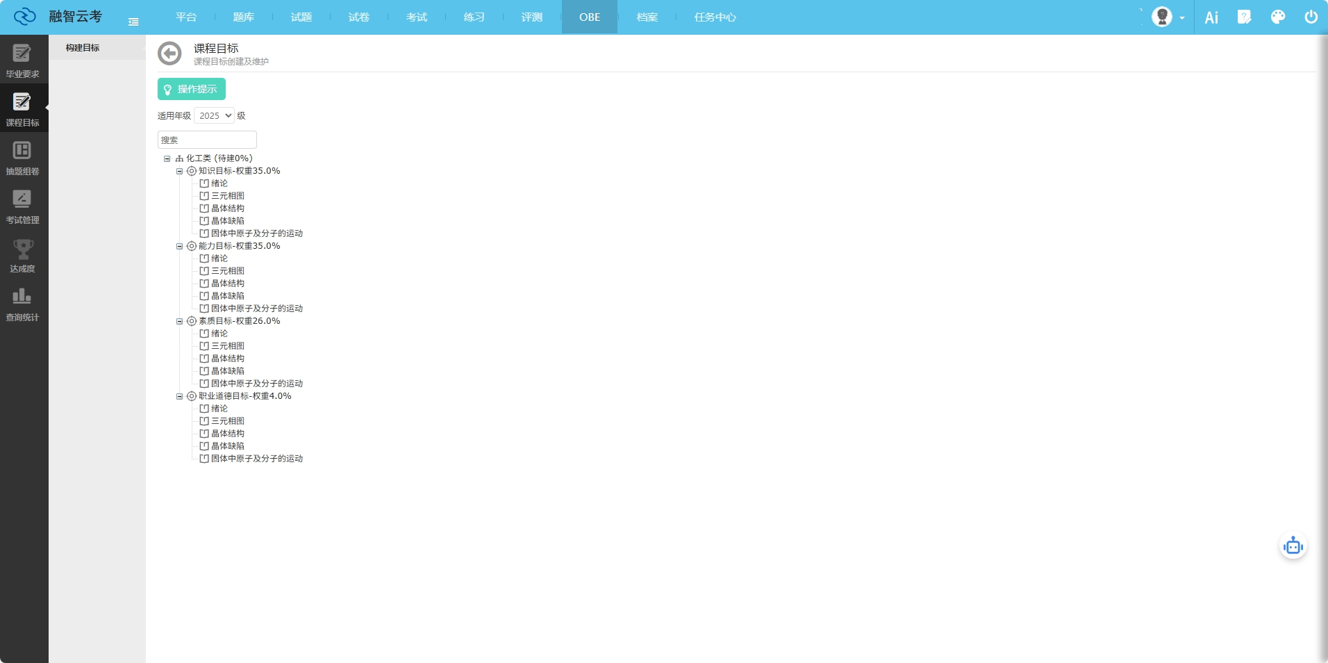 OBE讲授以“学生核心、导向、持续改良”为焦点,强调通过明白预期进修,反向设想课程系统取讲授方式。这一取我国工程教育认证尺度高度契合,已成为高校专业扶植的主要指南。融智云创软件无限公司的OBE处理方案笼盖了从专业扶植规划到课程方针告竣度阐发的全链条,通过数据驱动的体例帮帮高校实现讲授质量的可视化办理取动态优化。以某“双**”高校机械工程专业为例,引入OBE讲授后,该专业通过度解结业要求目标点,并操纵课程方针告竣度系统对每门课程的查核体例取内容进行了精准设想。实施一年后,学生工程实践能力评分提拔23%,专业成功通过工程教育认证。融智云创软件无限公司的焦点产物——课程方针告竣度系统,通过三大手艺模块实现讲授评估的智能化升级:据统计,利用该系统的高校平均缩短评估周期60%,数据精确率提拔至98%以上。某使用型本科院校使用后,其电子消息工程专业正在工程教育认证中因“评估系统完美、数据支持无力”获得专家高度评价。