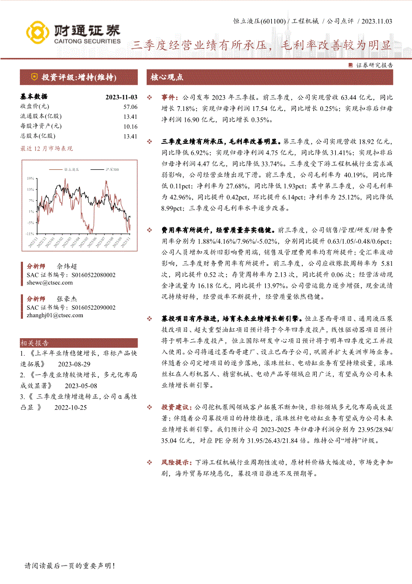 恒立液压(601100) /工程机械/公司点评/ 2023。11。03 ! 三季度经停业绩有所承压,毛利率改善较为较着 证券研究演讲投资评级!增持(维持) 焦点概念根基数据2023-11-03 收盘价(元) 57。06 畅通股本(亿股) 13。41 每股净资产(元) 10。16 总股本(亿股) 13。41 比来12月市场表示阐发师佘炜超SAC证书编号:S02 阐发师张好汉SAC证书编号:S02 相关演讲1。 《上半年业绩稳健增加,非标产物快速拓展》 2023-08-29 2。 《一季度业绩较快增加,多元化结构成效显著》 2023-05-08 3。 《三季度业绩增速转正,公司α属性凸显》 2022-10-25 事务:公司发布2023年三季报。